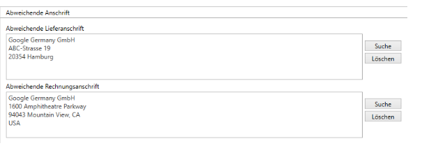 Dort können Sie auch über den Button „Suche“ die Liefer- oder Rechnungsanschrift eines anderen Kunden/Lieferanten zuweisen.