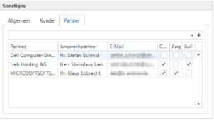 Durch das Feature ist es möglich zu einem Konto Partner zu hinterlegen. Diese sollen bei bestimmten Vorgängen (CRM-Aktivitäten, Angebote und Aufträge) automatisch als CC-E-Mail-Empfänger hinzugefügt werden, wenn eine Mail gesendet wird.