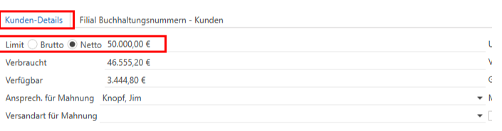 Im Kundenstamm kann unter Finanzen im Reiter/Tab "Kunden-Details" ein Kreditlimit hinterlegt werden: