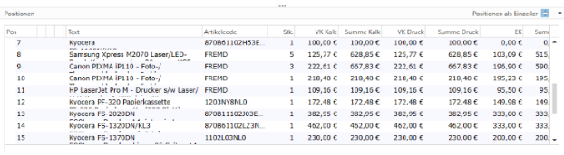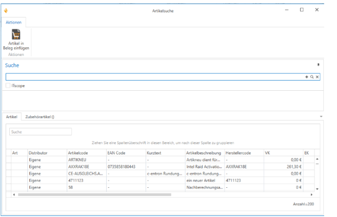 Über den Button wird eine neue Zeile eingefügt. Über die Lupe kann nun nach Artikeln gesucht werden, die bereits angelegt sind und der Warengruppe Dienstleistung oder Wegeentgeld zugeordnet wurden.