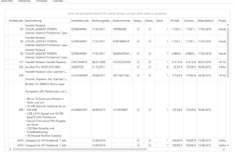 Mit dem Zusatzmodul PLM (Product Lifecycle Management) werden ihnen hier alle verkauften Artikel des Kunden angezeigt, die sie im PLM als Lizenzen gepflegt haben. Inklusive Ablaufdatum und sämtlicher Details wie SN, Preis, etc.