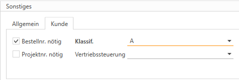 Wenn die Checkboxen „Bestellnr. nötig“ und „Projektnr. nötig“ aktiviert sind, müssen in den Kundenbelegen zwingend jeweils eine Bestellnummer und eine Projektnummer eingetragen werden. Wenn die Checkboxen inaktiv gesetzt wurden, können diese Nummern in den Belegen hinterlegt werden, sie sind dann aber keine Pflichtfelder.