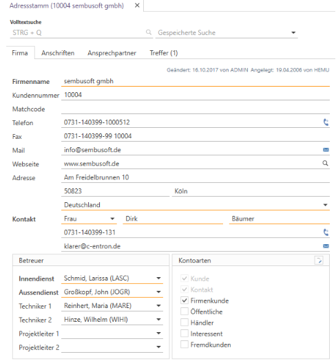 An Hand der Nummern wird auch festgestellt, welcher Kontoart die Adresse angehört. Ist nur eine Adressnummer vorhanden, handelt es sich um einen reinen Interessenten für den nur CRM Aktivitäten angelegt werden können, aber keine Belege oder Tickets. Ist zusätzlich noch eine Kundennummer hinterlegt, handelt es sich um einen Kunden, für den auch Kundenbelege und Tickets angelegt werden können. Ist die Lieferantennummer gepflegt, handelt es sich um einen Lieferanten/Hersteller, für den Lieferantenbelege und Tickets angelegt werden können. Eine Adresse kann aber auch zugleich eine Kundennummer als auch eine Lieferantennummer enthalten und ist somit sowohl ein Kunde als auch ein Lieferant und es können beide Belegarten angelegt werden.