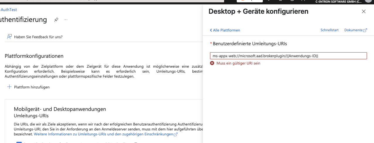 Geben Sie als benutzerdefinierte Redirect-URL eine URI mit folgendem Muster an: ms-appx-web://microsoft.aad.brokerplugin/{{Anwendungs-ID}}