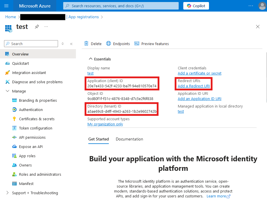 Nach der Erstellung der App-Registrierung finden Sie auf der Übersichtsseite die Client-ID und die Mandanten-ID (Tenant-ID).