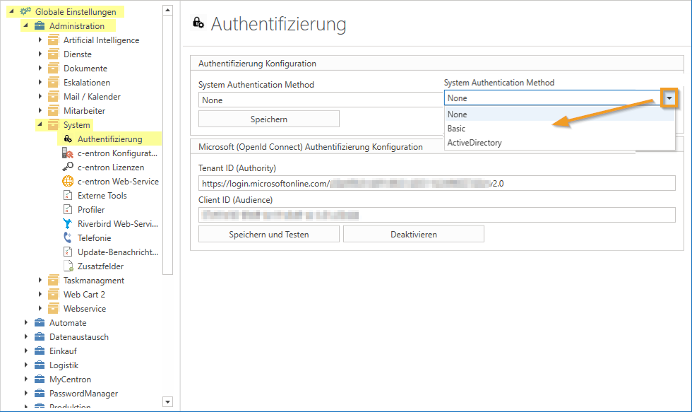 Die Konfiguration der Microsoft-Authentifizierung erfolgt in c-entron über die Globalen Einstellungen.