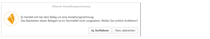 Die Zahlungskonditionen werden aus dem ursprünglichen Auftrag in die entsprechende Anzahlungsrechnung übertragen. Wenn versucht wird, für eine bestehende Anzahlungsrechnung eine neue Version zu erstellen, wird eine Warnmeldung angezeigt, da normalerweise keine Bearbeitung vorgesehen ist: