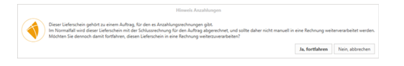 Zusätzlich erfolgt eine Warnmeldung, wenn versucht wird, einen Lieferschein in eine Rechnung umzuwandeln, der aus einem Auftrag mit Anzahlungsrechnungen stammt. Diese Warnung dient dazu, darauf hinzuweisen, dass üblicherweise die Lieferscheine zusammen mit den Anzahlungsrechnungen in der Schlussrechnung verarbeitet werden.