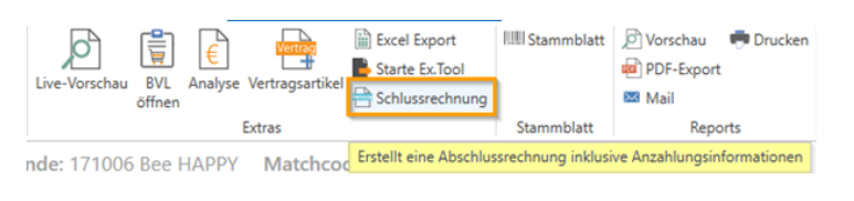 Über den Button [Schlussrechnung] in der Menüleiste/Ribbon unter Extras, werden alle noch nicht verarbeiteten Positionen, Lieferscheine und mit den vorhanden Anzahlungsrechnungen zu einer Abschlussrechnung verarbeitet