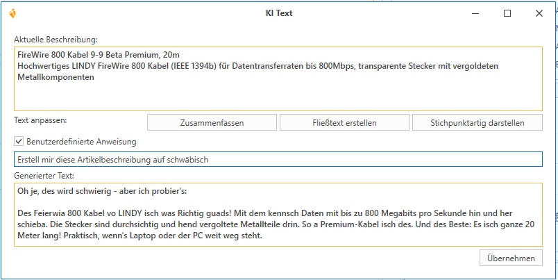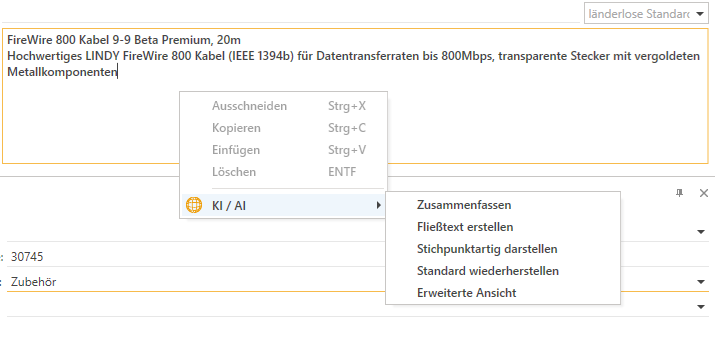 Im Kontextmenü (durch Rechtsklick) steht jetzt eine KI/AI-Funktion zur Verfügung, mit der die Artikelbeschreibung in nur wenigen Klicks angepasst werden kann. Dabei können verschiedene Optionen wie Zusammenfassen, Erstellen eines Fließtexts oder Stichpunktformatierung ausgewählt werden.
