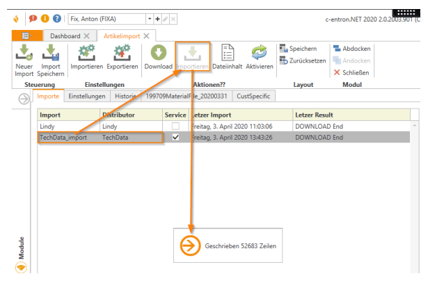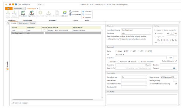 Über den Button [Importieren] in der Ribbon unter „Einstellungen“ kann eine entsprechende Import *.json Datei ausgewählt werden:Hier im Beispiel der FTP Import von TechData: