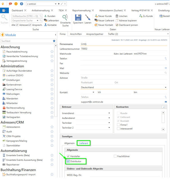 Bevor der „Artikelimport“ angelegt werden kann, muss zunächst der entsprechende Lieferant/Distributor im Adressstamm (Hier im Beispiel Lindy) angelegt sein.Dieser Lieferant muss zudem die Eigenschaft „Distributor“ aktiv haben: