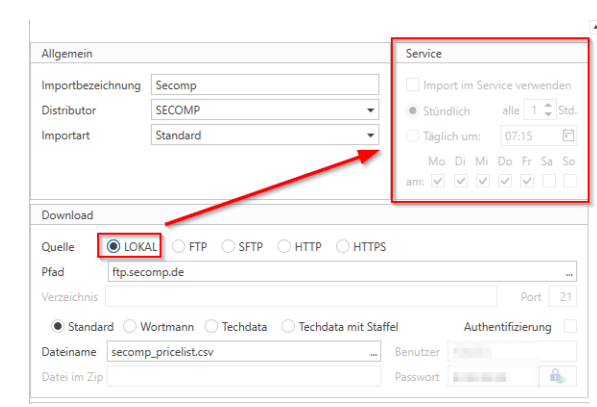 Lösung:Wenn im Artikelimport in den Einstellungen die Download-Variante "lokal" gewählt wird, wird der Bereich "Service" deaktiviert, da dieser nur manuell ausgeführt werden kann.