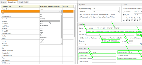 Im Modul c-entron Artikelimport tragen Sie nun die Einstellungen wie folgt ein: