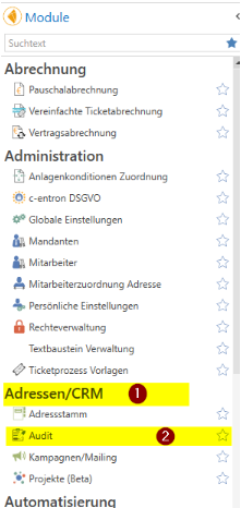 Das neue Modul Audit ist unter dem Modul Bereich Adressen/CRM -> Audit zu finden.