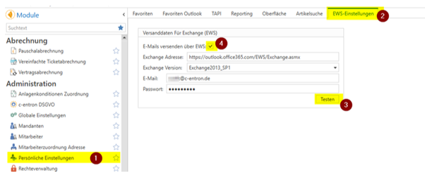 2.Hier im Reiter „EWS-Einstellungen“ die Daten ausfüllen.