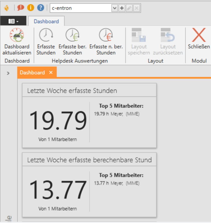 Feste Auswertungen sind die Erfassten Stunden, Erfassten berechneten Stunden und die Erfassten nicht berechneten Stunden. Zudem können Sie hier das Dashboard komplett aktualisieren.
