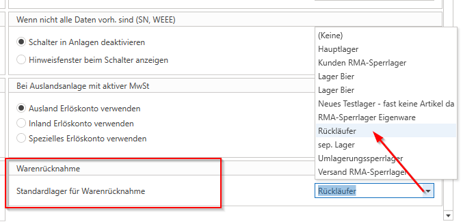 Hier kann im Feld „Warenrücknahme“ ein beliebiges, vorhandenes Lager als „Standardlager für Warenrücknahme“ vorausgewählt werden. Dieses wird dann bei jeder neuen Warenrücknahme als neues Ziellager vorausgewählt.