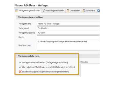 Der Bereich Vorlagenvalidierung zeigt Ihnen welche notwendigen Elemente in der Ticketanlage schon eingestellt wurden bzw. noch fehlen.