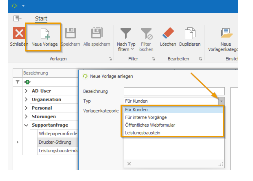 Für die Vorlagenerstellung nutzen Sie den Button „Neue Vorlage“, wählen eine passende Bezeichnung, die vorher definierte Vorlagenkategorie und die Art Ihrer Vorlage aus (Für Kunden, für interne Vorgänge oder Öffentliches Webformular)