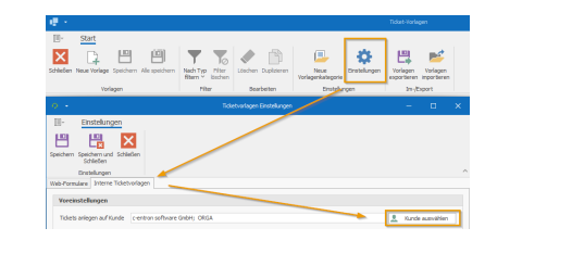 Wenn vor dem Vorlagenimport bereits ein Standard-Kunde für interne Tickets gewählt ist, so werden die importierten Vorlagen bereits damit vorgelegt. Hierzu bitte unter Einstellungen einen Standard-Kunden für die internen Tickets auswählen.