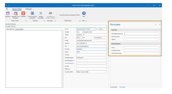 Bestehendes TicketIn ein bestehendes Ticket können Sie im geöffneten Ticket ebenfalls ein Formular hinzufügen: