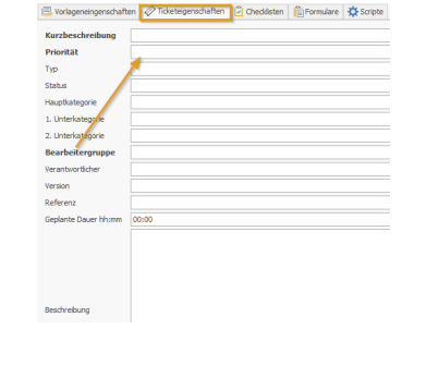 Im Reiter „Ticketeigenschaften“, legen Sie die Kriterien zur Ticketanlage fest. Diese Felder sind analog zur Ticketanlage im Service-Board.