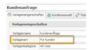 Kundenbezogene Formulare können Sie in den Vorlageneigenschaften über die Vorlageneigenart „Für Kunde“ definieren: