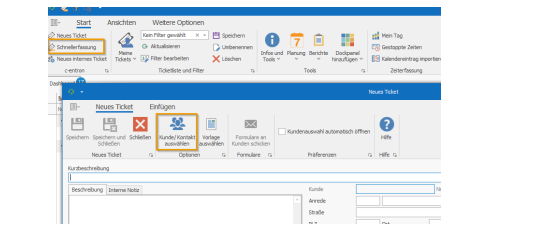 Die Schnellerfassung des Service-Boards greift ebenfalls auf die Ticketvorlagen zu. Hierzu gehen Sie auf Schnellerfassung -> Kunde / Kontakt auswählen