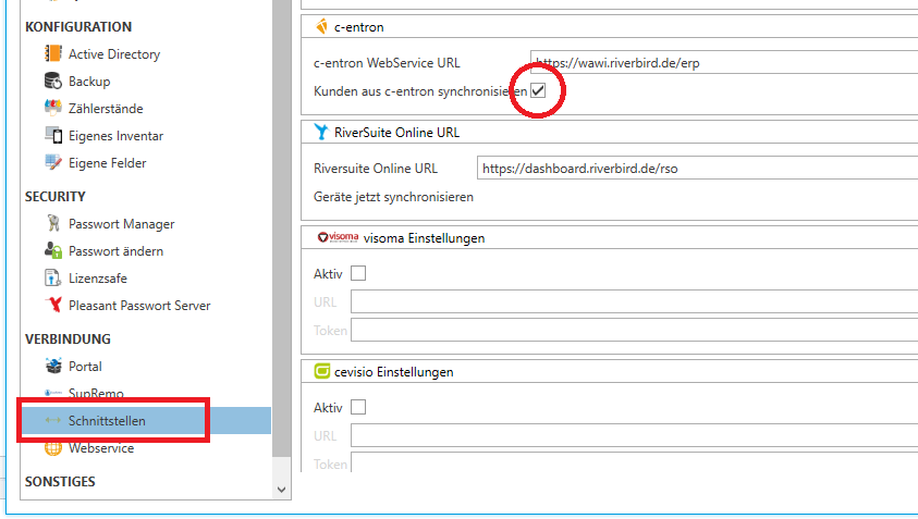 Gehe in der River Suite zu den Einstellungen → Schnittstellen → c-entron.