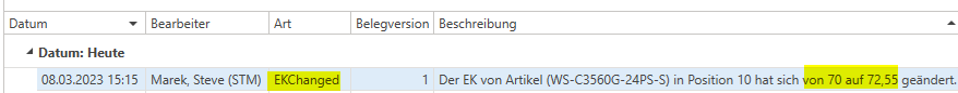 Wird eine EK Änderung im Beleg (Angebot & Auftrag) durch diese Einstellung verursacht, wird dies geloggt.