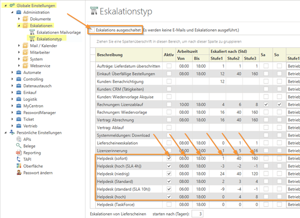 Damit der Eskalationsserver ordnungsgemäß funktioniert, darf unter Globale Einstellungen → Administration → Eskalationen → Eskalationstyp die Eigenschaft „Eskalationen ausgeschaltet“ nicht aktiv sein und es müssen aktive Eskalationen definiert werden, einschließlich:
