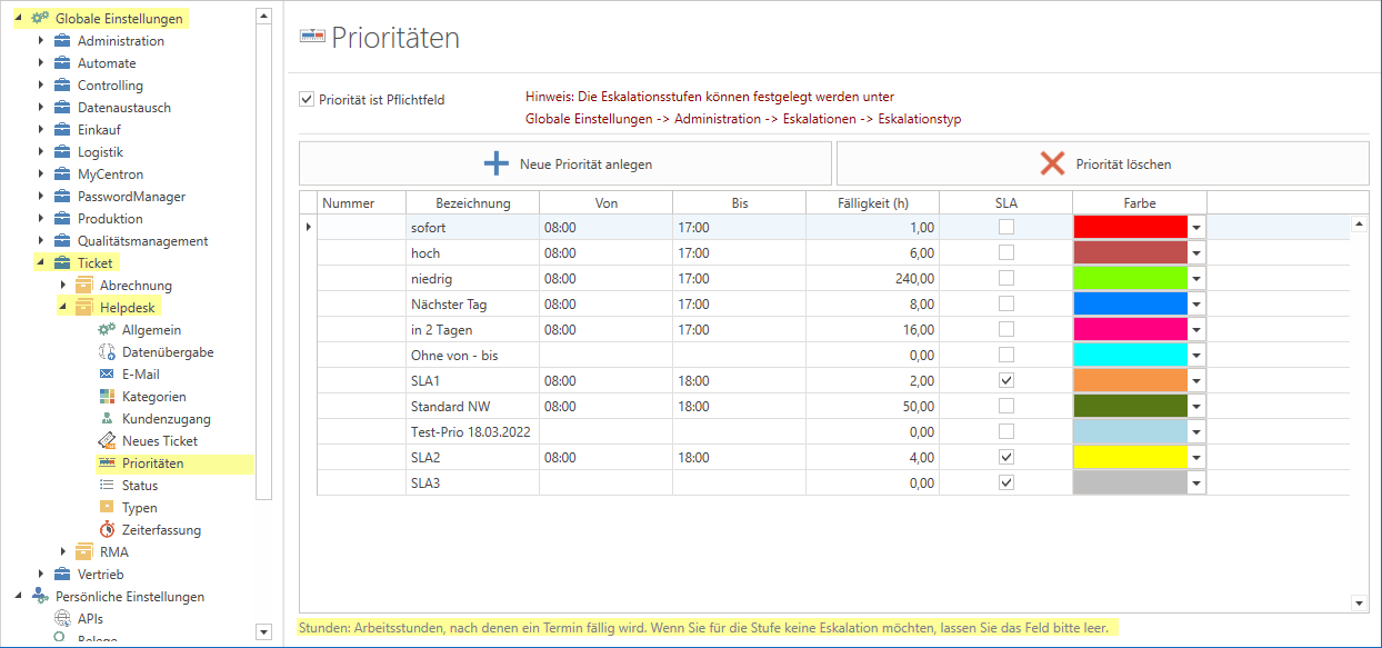 Ein neuer Helpdesk-Eskalationstyp kann unter „Ticket → Helpdesk → Prioritäten“ hinterlegt werden.