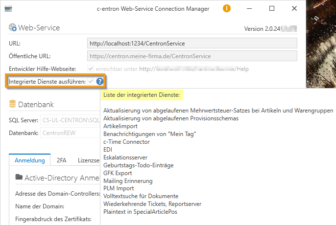 Damit der Eskalationsdienst funktioniert, muss die Option „Integrierte Dienste ausführen“ im c-entron WebService aktiviert sein.