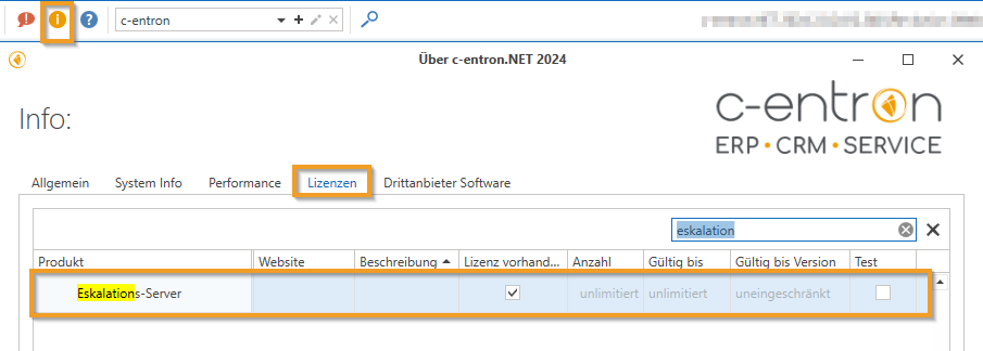 (HINWEIS: Welche Lizenzen Sie im Einsatz haben können Sie in der c-entron unter dem orangen (i) Info links oben unter dem Reiter/Tab „Lizenzen“ oder Globale Einstellungen – Administration – System – c-entron Lizenzen oder im c-entron Connection Manager durch Klick auf [Lizenzen anzeigen] oder in der c-entron unter Globale Einstellungen einsehen.)