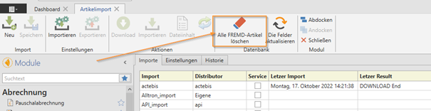Um die Tabelle "Herstellerartikel" zurückzusetzen, klicken Sie einfach auf den Button [Alle FREMD-Artikel löschen] im Artikelimport. Dadurch werden alle Fremdartikel aus Ihrer Datenbank entfernt, sodass keine mehr vorhanden sind.