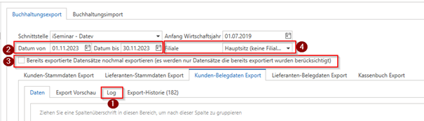 - Prüfen Sie in den globalen Einstellungen unter „Datenaustausch -> Buchhaltung -> Schnittstellen“ welche Schnittstelle Sie hier verwenden (z.B. „DATEV-Format“, „Lexware“, … - und geben Sie diese bitte bei Support-Anfragen auch gleich mit an) und ob diese ggf. eine Einstellung hat, die den Export „verhindert“, wie z.B. „Nur Kunden / Lieferanten mit Umsatz im gewählten Zeitraum exportieren“.