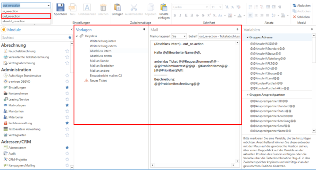 Es können für den Bereich Helpdesk filialbezogene Mailvorlagen hinterlegt werden.