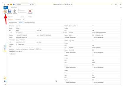 Um einen neuen Mandanten anzulegen gehen Sie im Bereich Administration auf den Menüpunkt „Mandanten“. Über den Button Neu können Sie direkt unter Angaben der Daten des Mandanten diesen neu anlegen. Bitte füllen Sie alle Felder aus, da Sie die Daten auf den Belegen andrucken können.