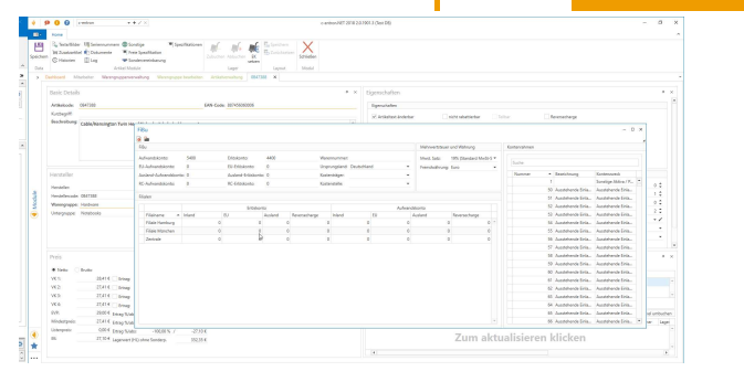 Um auch eine entsprechende Trennung der Filialen in der Finanzbuchhaltung zu erreichen, können Sie in den Warengruppen pro Filiale ein separates Erlöskonto und Aufwandskonto hinterlegen. Dieser Vorschlagswert wird dann für die Artikelneuanlage verwendet und kann im einzelnen Artikel entsprechend noch verändert werden. Sie gelangen zu den Warengruppen über Stammdaten->Warengruppenverwaltung.