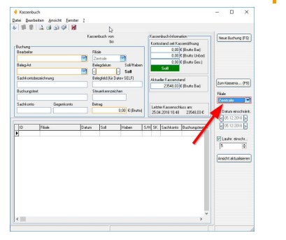 Unter dem Punkt Kassenbuch können Sie einstellen für welche Filiale das Kassenbuch gültig sein soll. Sie können somit für jede Filiale ein eigenes Kassenbuch führen.