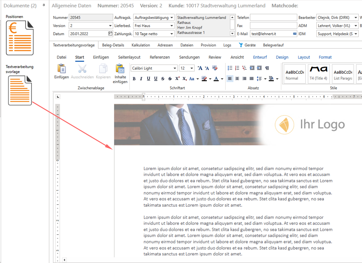 Zudem können Sie eingefügte Dokumente wie z.B. Word Dateien noch ergänzen bzw. ändern über die „Editoransicht“. Dazu einfach das Dokument markieren.