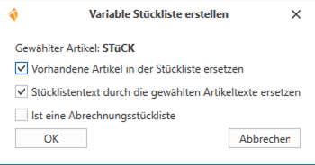 Stücklistentext durch den gewählten Artikeltexte ersetzen aktivieren, wenn die Texte der einzelnen Positionen mit in den Stücklistenkopf übernommen werden soll.