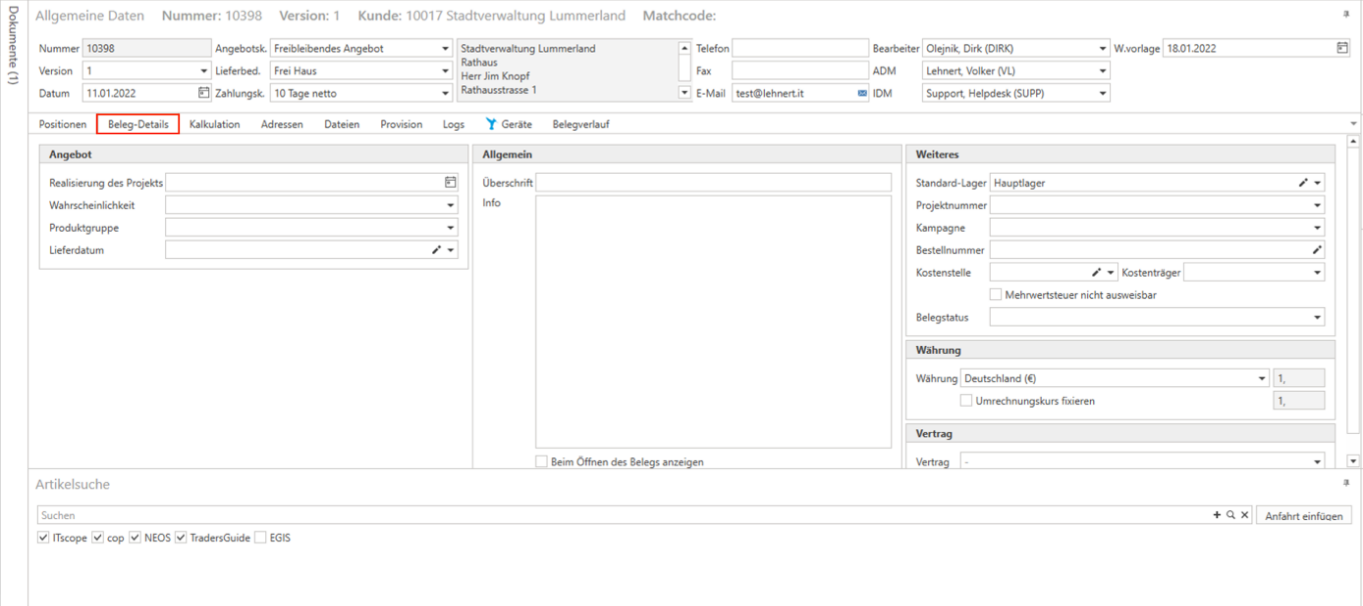 In den Beleg Details können verschiedene Informationen hinterlegt werden.