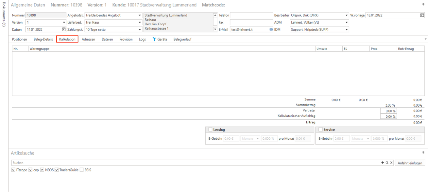 Der Informationsbereich ist aufgeteilt in Kalkulation (Beleg), Artikel Information, Preismatrix und Weiterverarbeitet aus / in