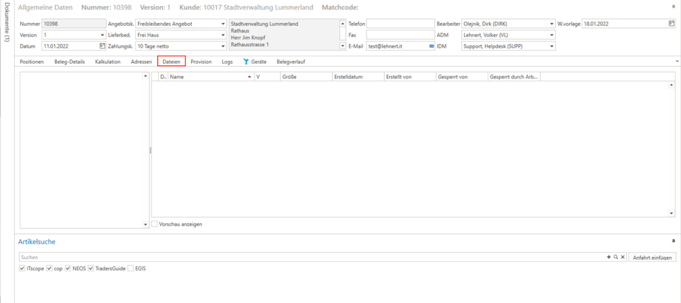 Unter dem Reiter Dateien können sämtliche Dateien wie z.B. Mails mit dem Kunden, PDF-Dateien des Angebots vom Lieferanten, Handbücher etc. abgelegt werden. Diese finden Sie auch im Adressstamm unter Dokumente mit der entsprechenden Belegnummer wieder.