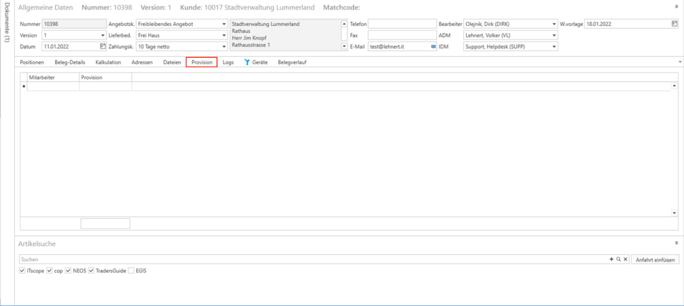 Wenn Sie die Zugänge für die Live-Artikelabfragen in den Einstellungen gepflegt sind, werden diese unter der Artikelsuche aufgelistet (ITscope, cop, NEOS, TradersGuide, EGIS)