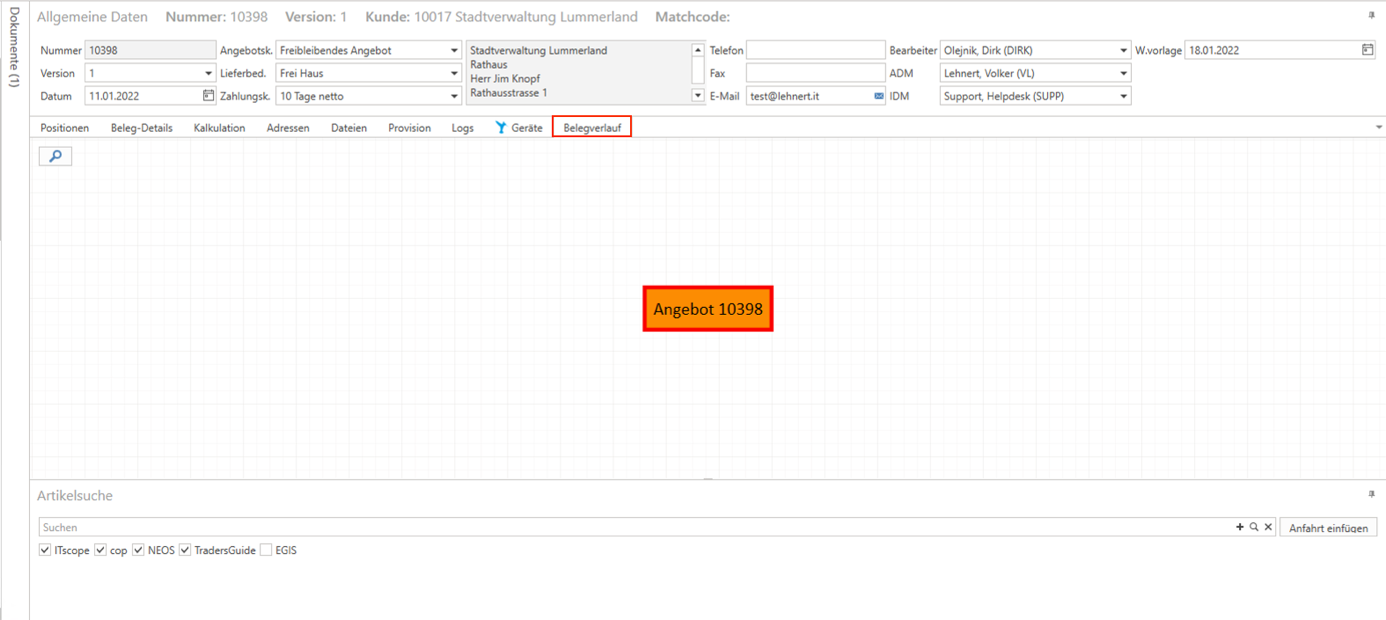 Im Belegverlauf können Sie per doppelklick den entsprechenden Beleg öffnen. Wenn der Beleg markiert wird, erhalten Sie eine Übersicht über die Positionen, Beschreibung etc.