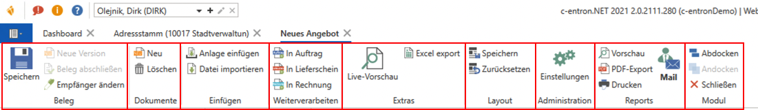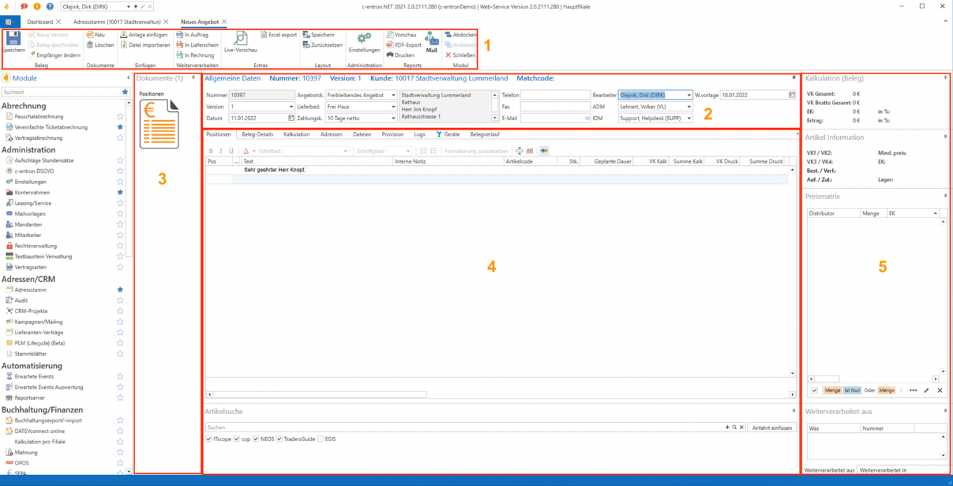 Über „Schließen“ wird z.B. das Angebot geschlossen, sollte der Beleg noch nicht gespeichert worden sein, erscheint eine entsprechende Meldung.