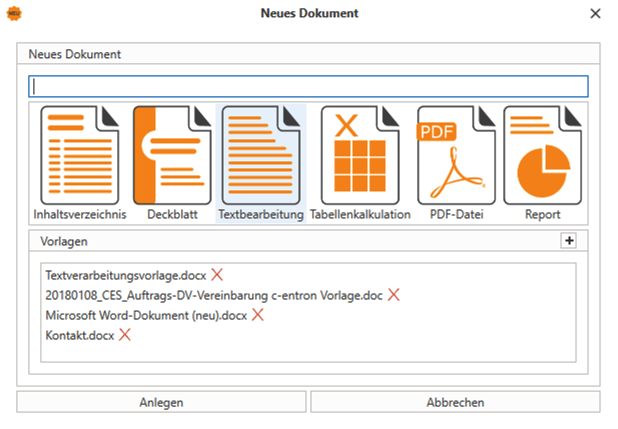 Hier können Dokumente aus einer Auswahl (siehe Screenshot) zu dem Beleg hinzugefügt werden. Praktische Beispiele sind hier z.B. Produktdatenblätter, ein Deckblatt des eigenen Unternehmens oder AGBs.